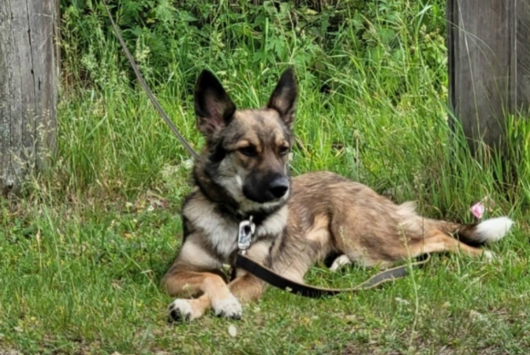 Людмила описывает питомца: «Масяня, 4 года, стерилизованная девочка, тонкокостная, серо-рыжая дворняжечка, выше колена. Кончики хвостика и передних лапок — белые».