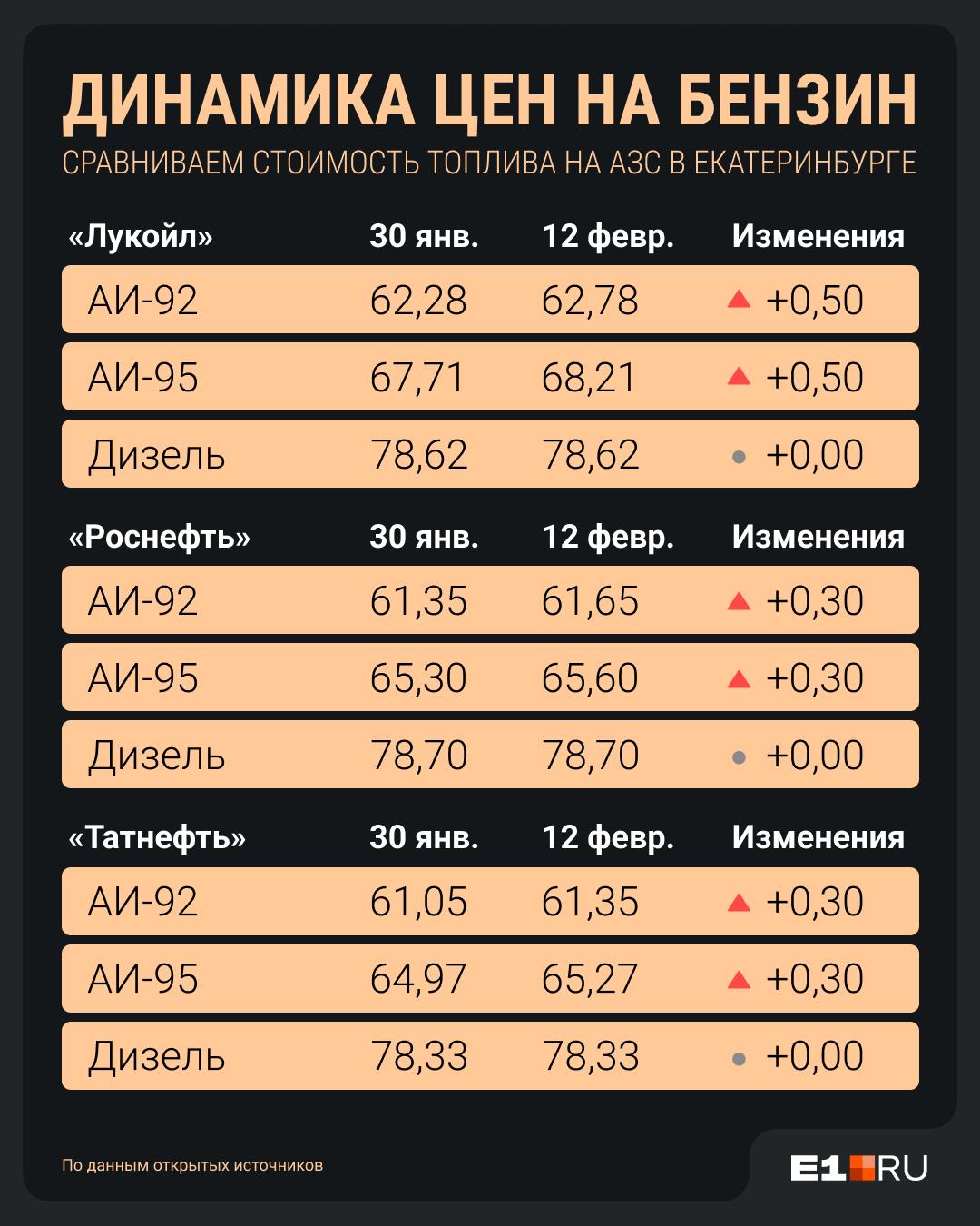 Среди сетей АЗС самой дорогой АИ-92 оказался на заправках «Газпромнефти» — 62,83 рубля за литр, что на 20 копеек выше, чем две недели назад. У «Лукойла» цена выросла на 50 копеек до 62,78 рубля. «Роснефть» и «Татнефть» повысили стоимость на 30 копеек, до 61,65 и 61,35 рубля соответственно.