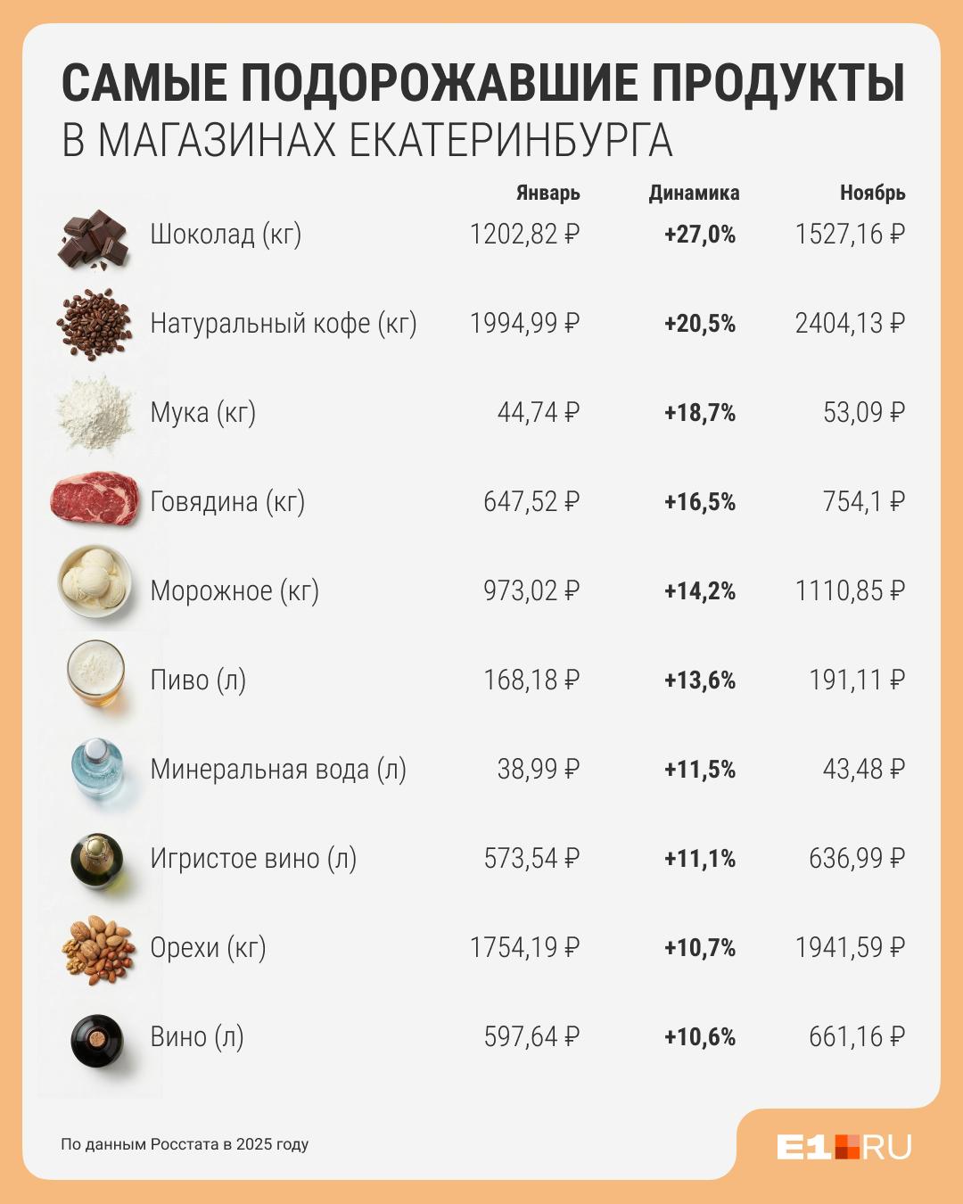 Наибольший рост цен за 2025 год в Екатеринбурге показали шоколад и кофе. Алкогольная продукция также существенно подорожала, в то время как овощи стали значительно дешевле. Изменения стоимости основных товаров анализировались на основе данных с января по ноябрь.