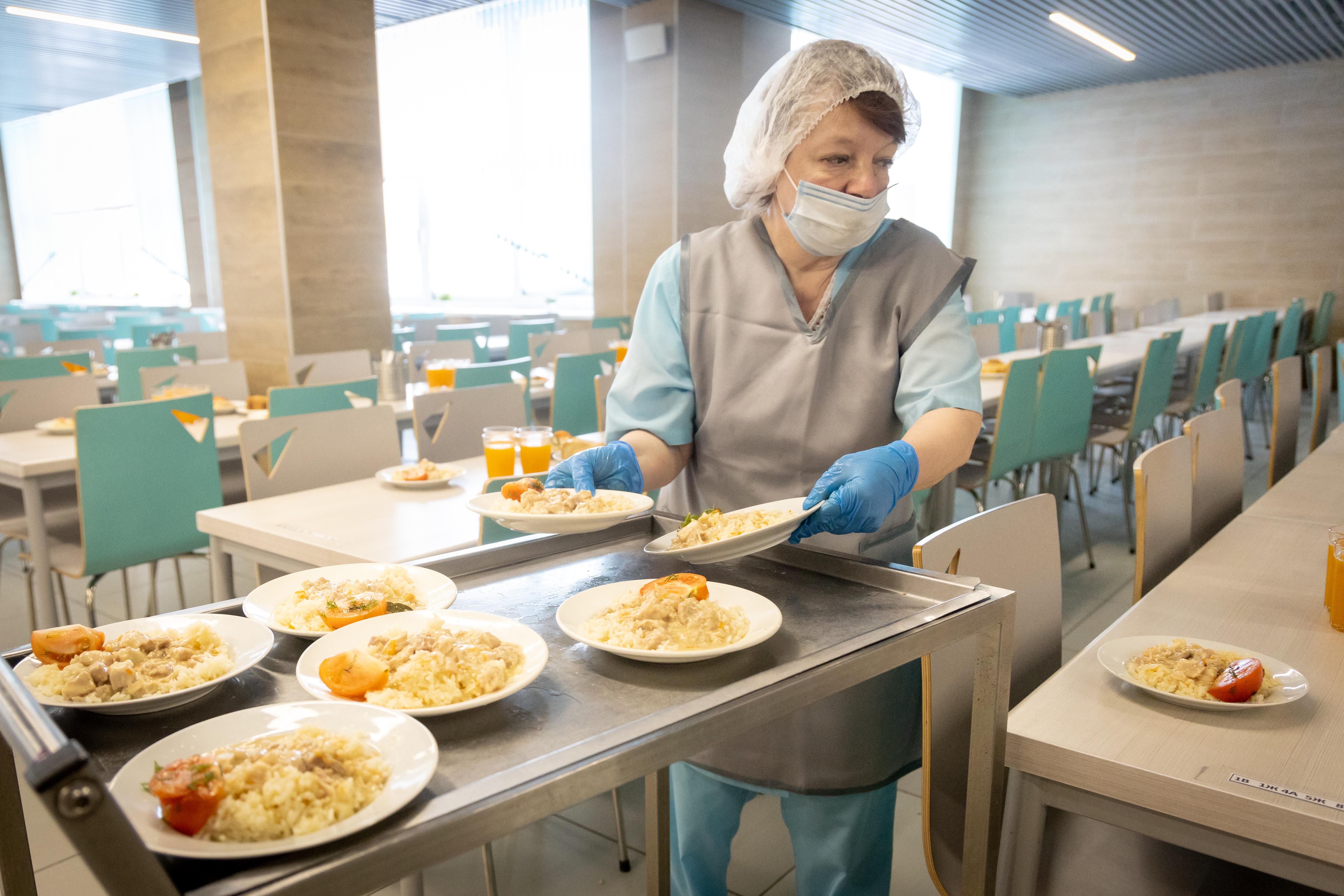 Персонал столовой быстро накрывает столы