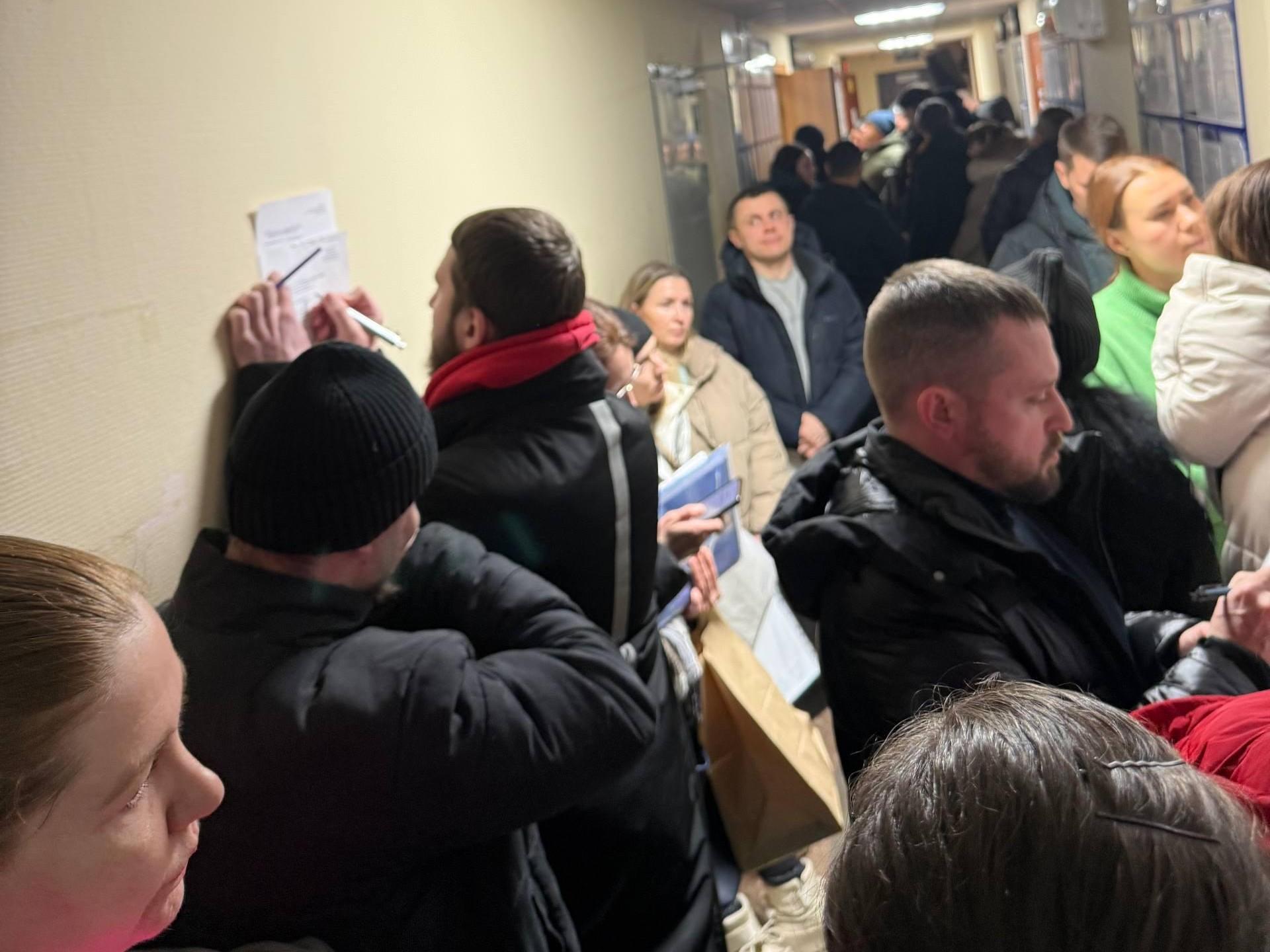 Люди самостоятельно ведут списки в очереди в отделении полиции.