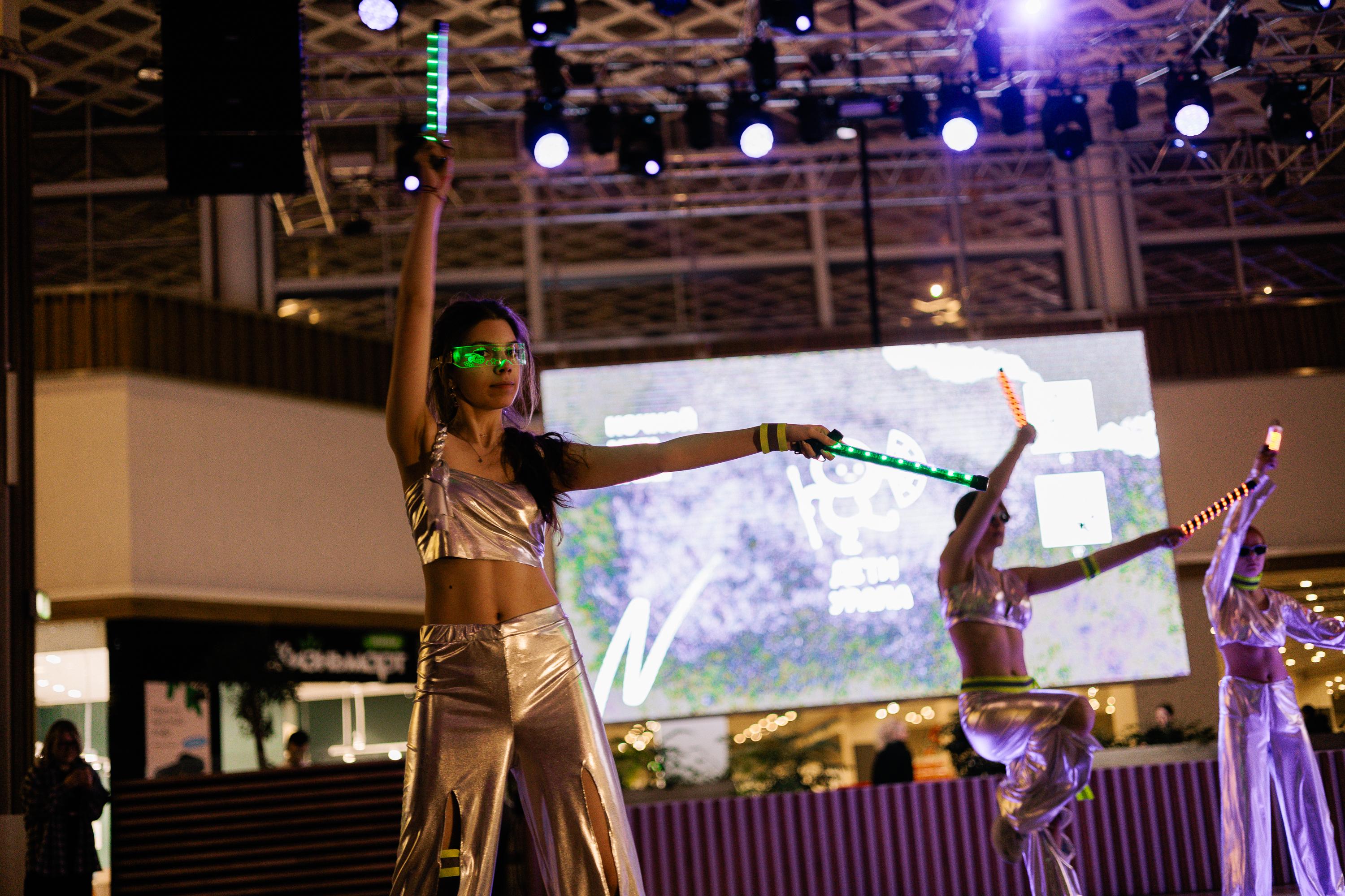 Диджеи и танцовщицы в неоновых костюмах создавали праздничную атмосферу.