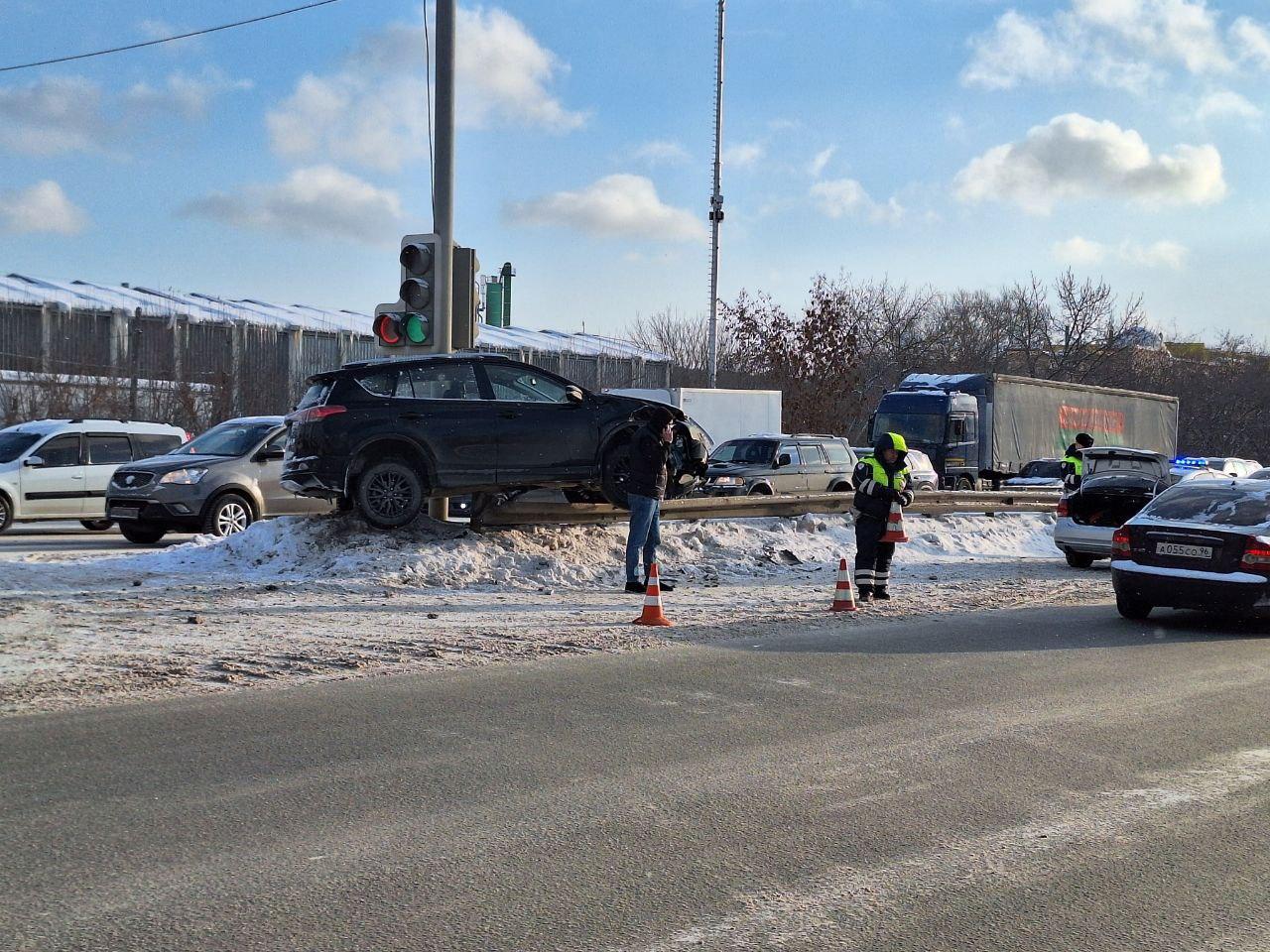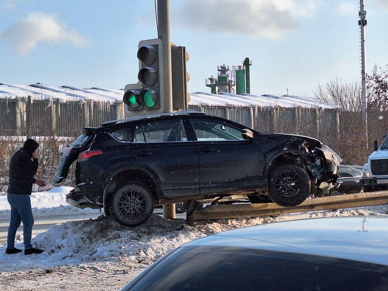 Кроссовер в Екатеринбурге врезался в столб и повис на ограждении
