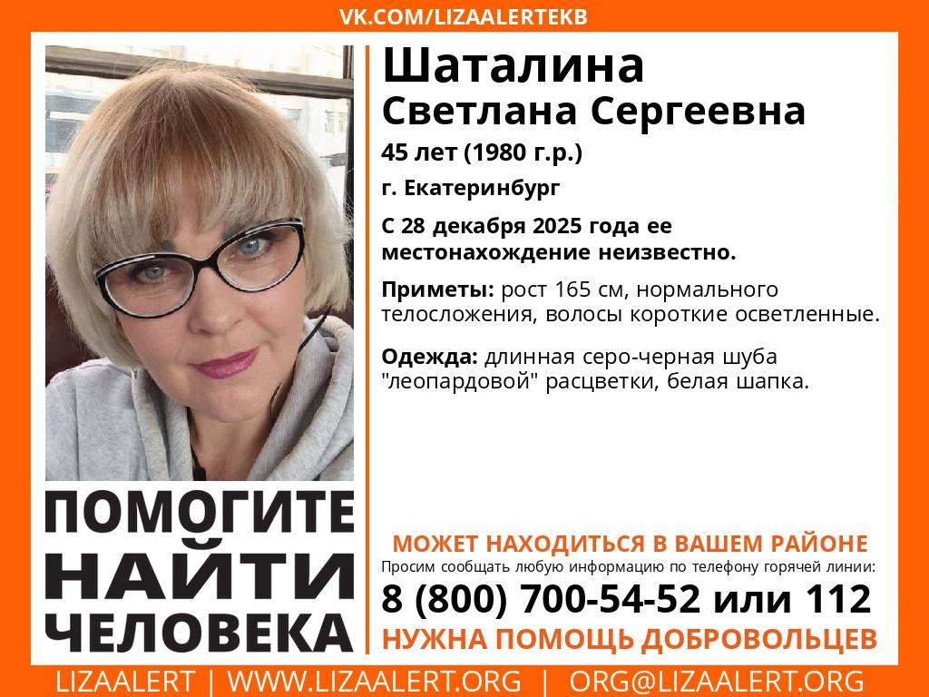 По данным поискового отряда «ЛизаАлерт», 16 января в Екатеринбурге приостановлены поисковые работы по обнаружению 45-летней Светланы Шаталиной. Причины, по которым волонтеры временно прекратили деятельность, не уточняются.