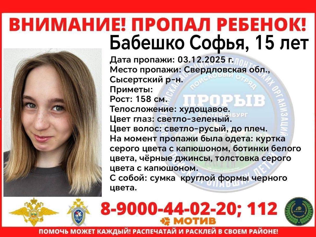 Полиция и добровольцы ищут 15-летнюю Софью Бабешко, которая не вернулась домой после занятий в школе поселка Верхняя Сысерть Свердловской области. По данным поискового отряда «Прорыв», девочка пропала днем 3 декабря, и с тех пор ее местонахождение неизвестно.