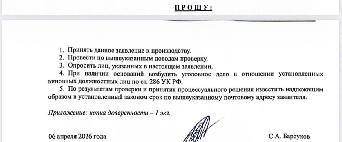 Барсуков подчеркнул, что все действия совершались без присутствия родителей подростка. Он просит руководителя Следственного комитета организовать проверку и, при выявлении оснований, возбудить уголовное дело по статье 286 УК РФ о превышении должностных полномочий.