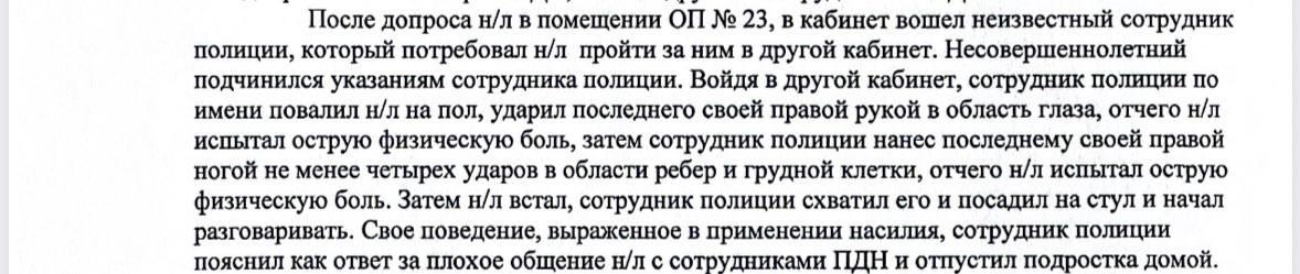 В направленном Александру Бастрыкину документе описаны подробности инцидента. «После допроса в помещении ОП-23 в кабинет вошел неизвестный сотрудник полиции, который потребовал несовершеннолетнего пройти за ним в другой кабинет. Несовершеннолетний подчинился указаниям сотрудника полиции. Войдя в другой кабинет, сотрудник полиции повалил несовершеннолетнего на пол, ударил последнего своей правой рукой в область глаза, отчего несовершеннолетний испытал острую физическую боль. Затем сотрудник полиции нанес последнему своей правой ногой не менее четырех ударов в области ребер и грудной клетки», — указано в заявлении.