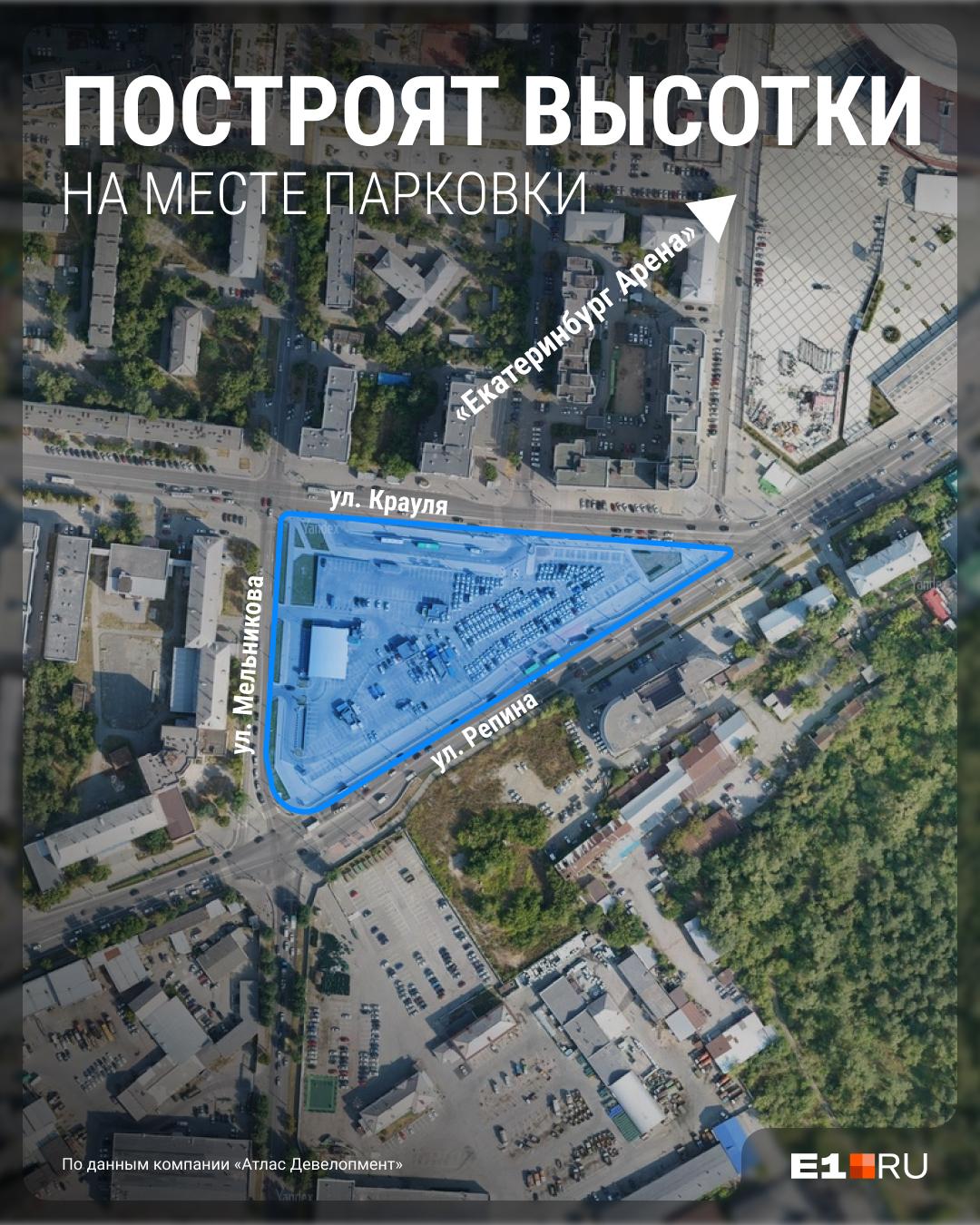 Бывшую парковку на пересечении улиц Репина, Крауля и Мельникова возле «Екатеринбург-Арены» обнесли забором. За ограждением уже ведётся активная работа строительной техники. В компании «Атлас Девелопмент» сообщили о начале подготовки участка для будущей застройки.
