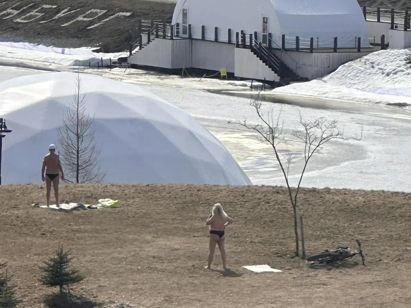 Жители города вышли загорать в парк, несмотря на лед и снег вокруг, из-за аномально теплой погоды.