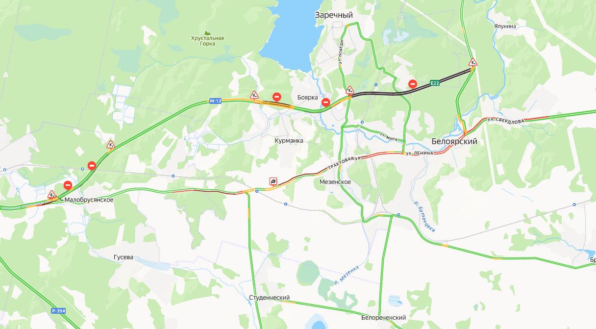 На трассе скопилась пробка, протяженность которой составила около 19 километров. Для объезда затора рекомендуется использовать новое направление автодороги «Обход поселка Белоярский».