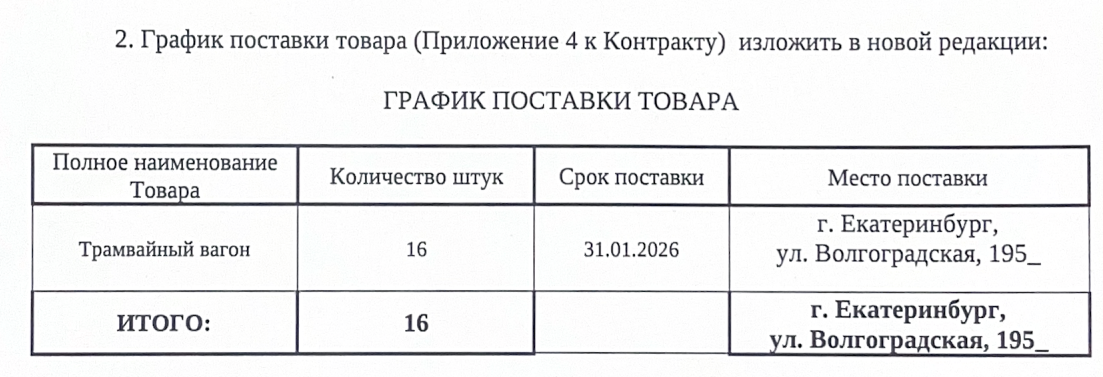 Согласно документу на портале госзакупок, Екатеринбургу доставят дополнительный трамвай модели «Кастор». Он станет 16-м по счёту. В заключённом допсоглашении между администрацией города и Усть-Катавским вагоностроительным заводом указан крайний срок поставки — 31 января 2026 года.