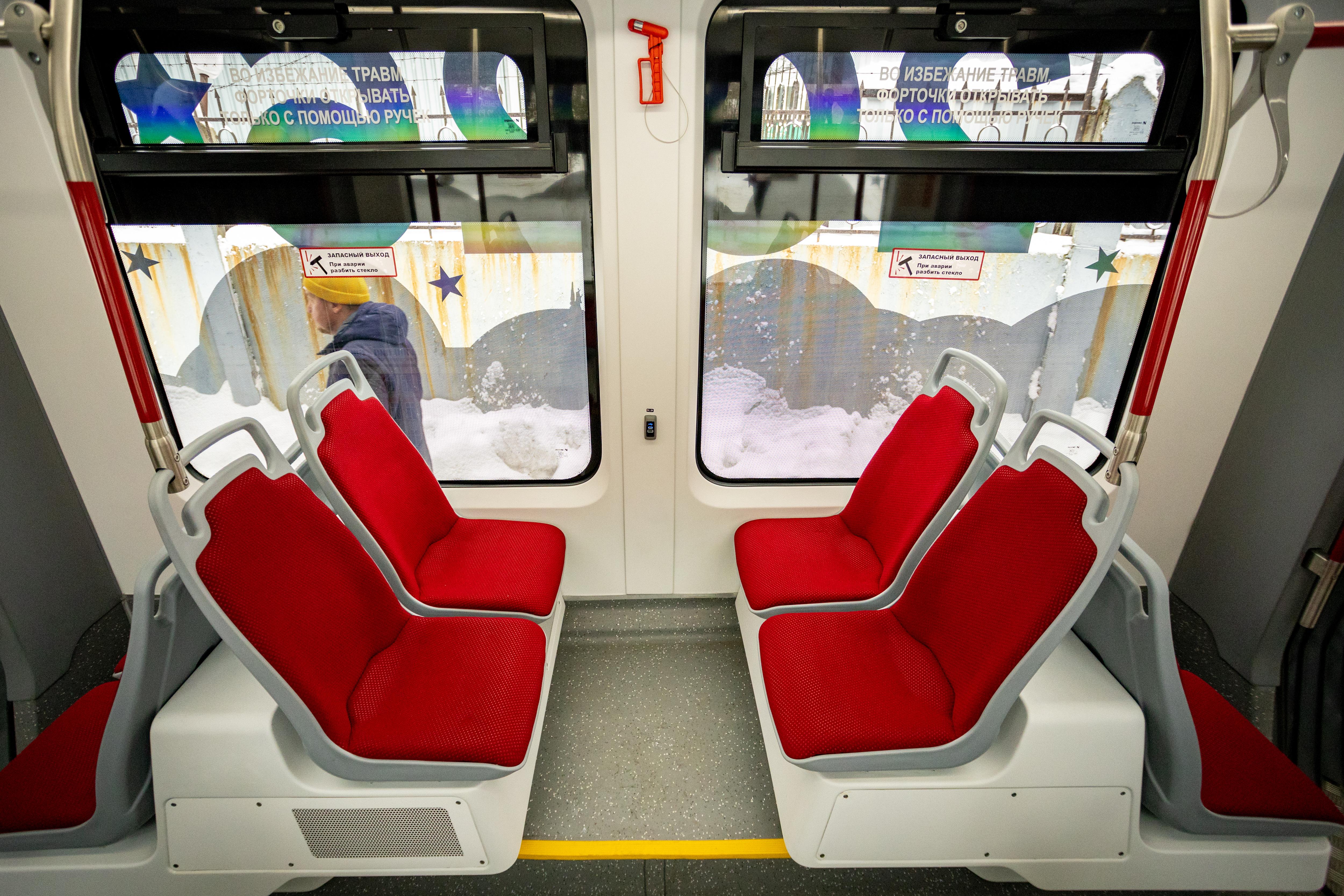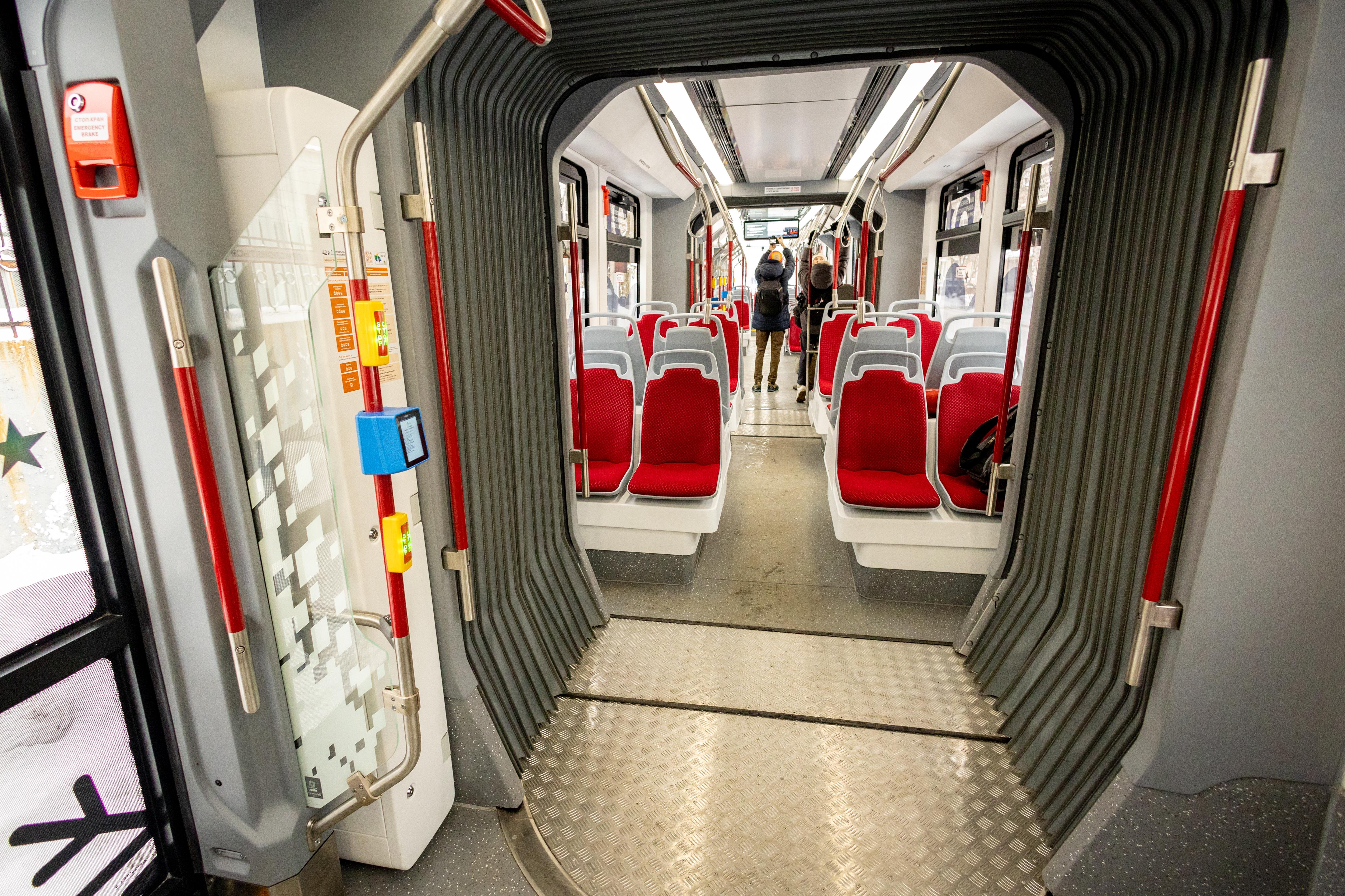 Вагон оборудован полностью низким полом, незначительными уклонами и широкими дверными проемами.