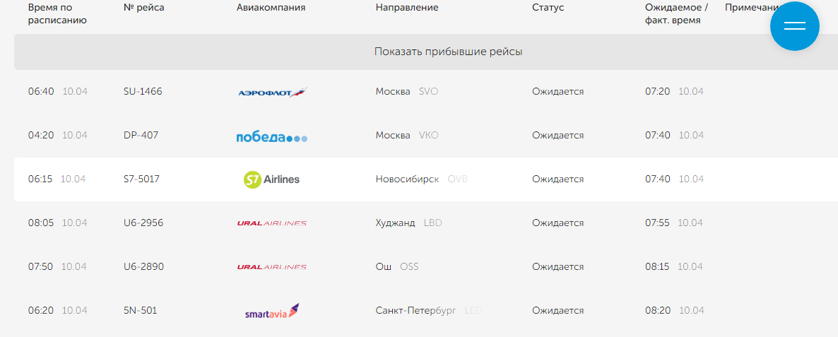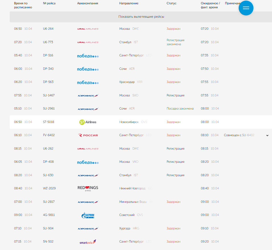 Утром 10 апреля аэропорт Кольцово ввел ограничения на взлет и посадку воздушных судов, из-за чего ближайшие рейсы переведены в статусы «задержан» или «ожидается».