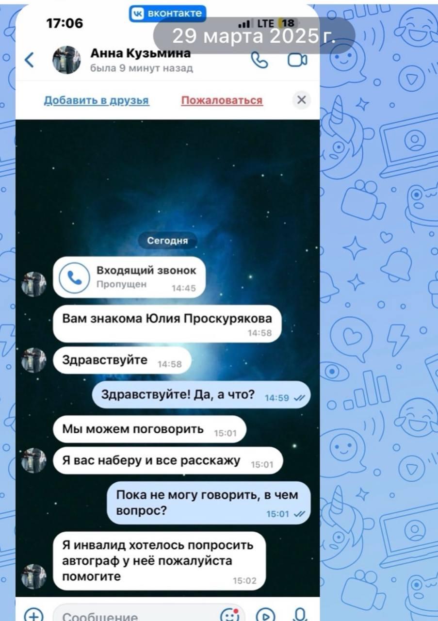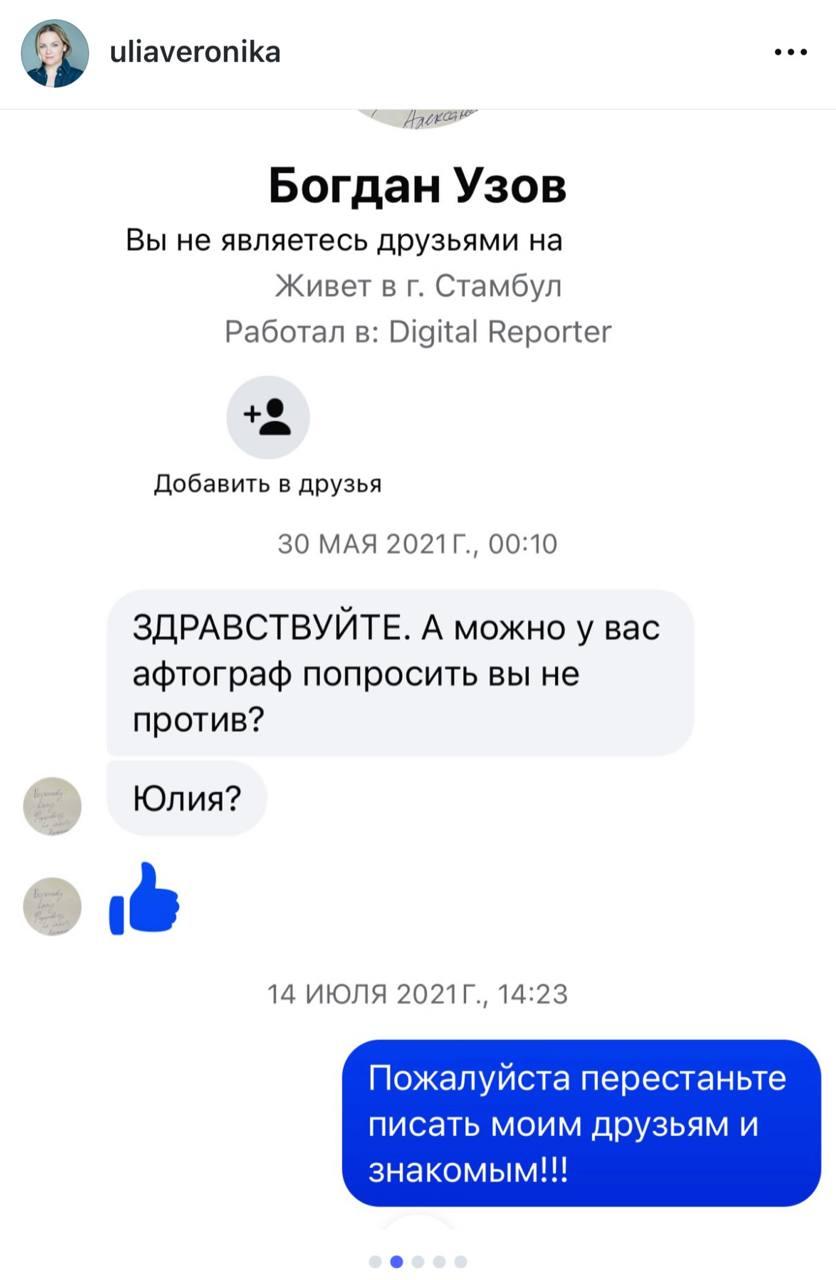 Как сообщила сама Юлия, преследователь постоянно меняет имена, под которыми представляется, и обращается к её друзьям и знакомым, пытаясь получить контактные данные. Женщина попросила коллег не передавать её номер телефона и сохранять бдительность, поскольку сталкер продолжает обманывать людей из её окружения.